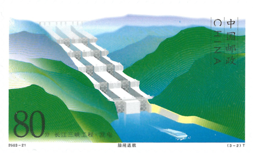 长江三峡工程是世界上最大的水利枢纽工程,是具有防洪、发电、航运等巨大综合效益的水资源多目标开发工程。工程总工期为17年,分三个阶段施工。1993年-1997年为第一阶段,以实现大江胜利截流为标志;1998年-2003年为第二阶段,以实现水库初期蓄水到高程135米、双线五级船闸通航和首批机组发电为标志;2004年-2009年为第三阶段,以实现全部机组发电和枢纽工程全部完建为标志。这套邮票图案旨在表现这一伟大工程第二阶段水库蓄水、船闸通航、电站发电三大目标的顺利实现。