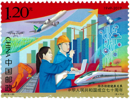 2019年是中华人民共和国成立70周年,首都北京举行隆重热烈的庆祝活动。庆祝活动充分 展示中华人民共和国成立70年来的光辉历程、伟大成就和宝贵经验,突出展示党的十八大以来以习近平同志为核心的党中央团结带领全党、全军、全国各族人民,进行伟大斗争、建设伟大工程、推进伟大事业、实现伟大梦想、推动党和国家事业取得的历史性成就、发生的历史性变革,激励和动员全党、全军、全国各族人民紧密团结在以习近平同志为核心的党中央周围,不忘初心,牢记使命,为决胜全面建成小康社 会夺取新时代中国特色社会主义伟大胜利、实现中华民族伟大复兴的中国梦不懈奋斗。70年砥砺奋进,中国共产党紧紧依靠人民,跨过一道又一道沟坎,取得一个又一个胜利,创造了人类发展史上惊天动地的奇迹,让中华文明在现代化进程中焕发出新的蓬勃生机,让科学社会主义在21世纪焕发出新的蓬勃生机,使中华民族焕发出新的蓬勃生机。在庆祝新中国成立70周年之际,中国邮政发行纪念邮票,展示祖国 在经济、政治、文化、社会、生态文明等方面取得的巨大成就。邮票设计采用壁画的构图特点和连票的设计形式,既庄重大方,又风格清新。