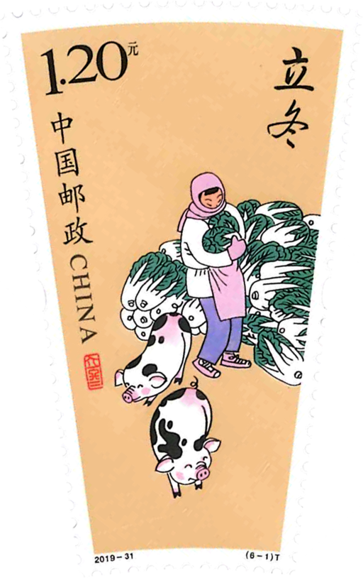 二十四节气是我国古代先民认知天象、物候、时令和大自然变化规律的知识体系与社会实践。2016年,二十四节气被列入联合国教科文组织人类非物质文化遗产代表作名录。本套邮票是自2015年开始发行的二十四节气系列邮票第四组,表现冬天的六个节气。经过了春天的草长莺飞、桃红柳绿,夏天的阳光灿烂、浓荫匝地,秋天的金风送爽、硕果累累,便迎来了飞雪凝霜、寒风刺骨的冬天。这六个节气分别是:立冬、小雪、大雪、冬至、小寒、大寒。