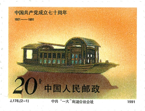 今年七月一日,是中国共产党成立七十周年纪念日。为纪念中国共产党领导全国人民为民族的解放和国家的富强经过长期革命斗争而取得的光辉业绩,特发行纪念邮票一套两枚。邮票设计采用装饰性画法,第一图属南湖船,表现中共“一大”南湖会议会址,宣告党的成立;第二图表现党的70年光辉历程。