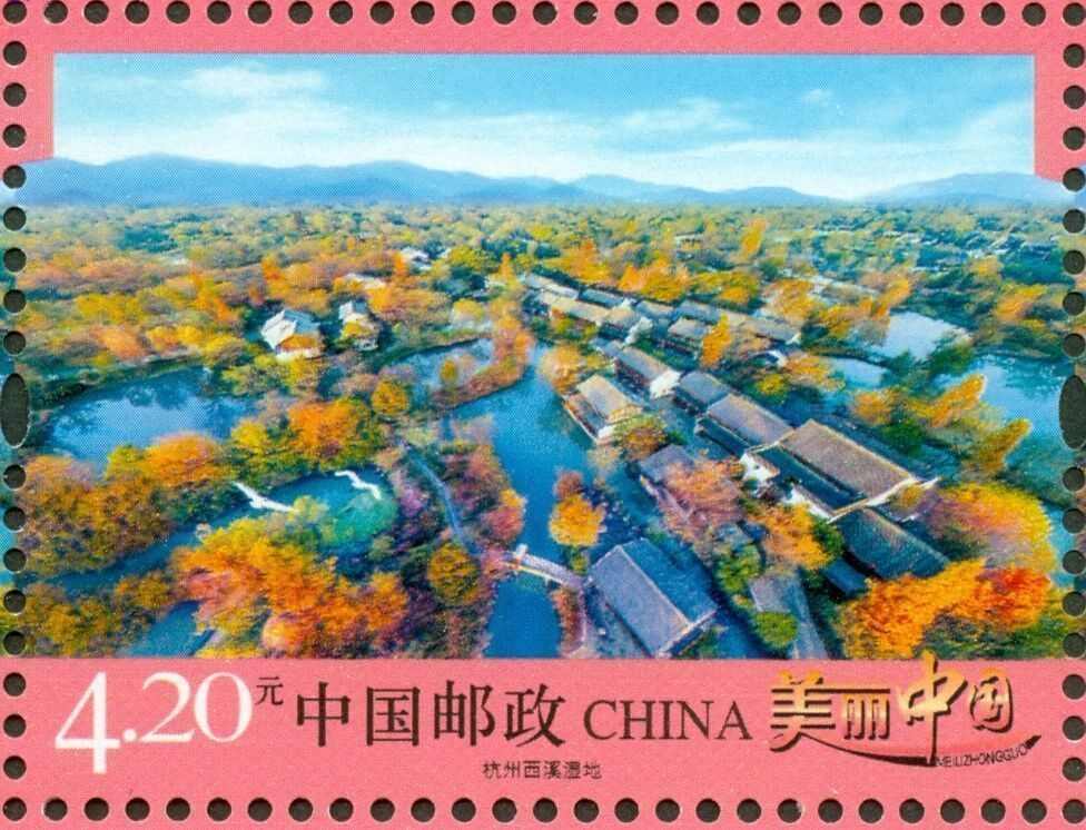 《美丽中国》普通邮票第二组延续了第一组的设计风格,选取我国东南西北各地风光,其地貌差别大,风景多样,方寸之上展示了我国的幅员辽阔,山川秀美。第一图黑龙江省牡丹江市双峰林场雪乡,表现冬季积雪覆盖的北国风光;第二图贵州省兴义市万峰林,其喀斯特地形地貌典型突出,形成了独特的锥状喀斯特地质景观;第三图宁夏回族自治区石嘴山市沙湖,沙漠与水域毗邻而居,既有大漠戈壁之雄浑,又有江南水乡之秀美,画面表现了当地良好的自然和生态环境;第四图浙江省杭州市西溪湿地,为国家湿地公园,其间水道如巷、河汊如网,鱼塘栉比、诸岛棋布,动植物资源丰富。