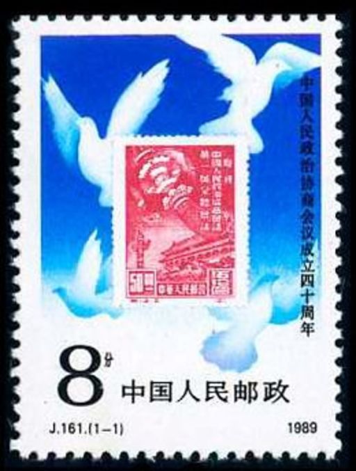 邮票以1949年10月8日发行的“庆祝中国人民政治协商会议第一届全体会议”纪念邮票(纪1)为主画面,周围边框饰以蓝色,象征辽阔无垠的蓝天。四周绘有四只和平鸽与主图相呼应,这种设计形式既具有历史性,又富于现实感。