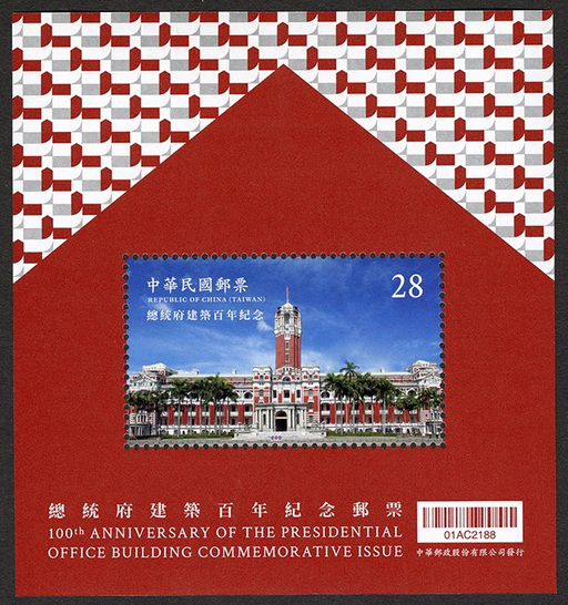 二、小全张(面值28元):内含邮票1枚,以总统府建筑全景为主图,背景以砖红底色及主视觉图纹组合,展现总统府建筑之庄严气势。