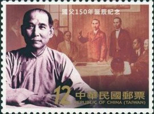 104年11月12日适逢国父诞辰150年,为表崇敬及缅怀之意,台湾中华邮政特规划发行纪念邮票1组2枚。邮票图案简介如下: