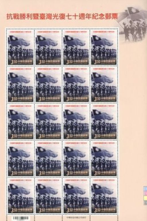 八年抗战是中国历史上规模最大、死伤人数最多且影响最深远的民族御侮战争,在全民同仇敌忾、团结御侮下,于1945年8月14日终获胜利。台湾于1895年马关条约中割让给日本,随着对日抗战胜利,1945年10月25日,台湾、澎湖重归中国版图。2015年为抗战胜利暨台湾光复七十周年,为纪念此一重大历史事件,台湾中华邮政特规划邮票1组4枚,相关图档由国史馆、中央通讯社授权。图案简介如下: