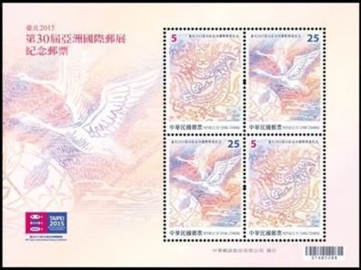 台北2015第30届亚洲国际邮展订于104年4月24日至28日在台北世贸中心展览三馆举行,为志邮展盛事,台湾中华邮政特于首展日发行纪念邮票1组2枚及小全张1张。本组邮票采微小字设计,以「传承、创新」之理念,重新诠释「海关一次云龙邮票」(简称大龙票)及「上海版飞雁基数邮票」。邮票采横联刷设计,2枚邮票间之过桥,以祥云呈现30意象,与「第30届亚洲国际邮展」相呼应。图案简介如下: