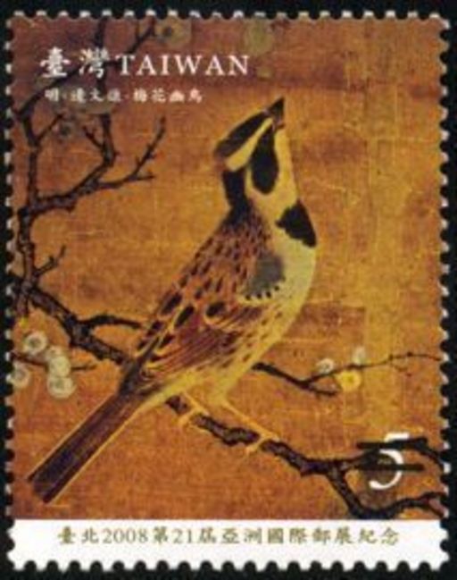 「台北2008第21届亚洲国际邮展」定于97年3月7日至11日在台北世界贸易中心展览三馆举行,为纪念2008年邮展盛事,台湾中华邮政特以广受大众喜爱的故宫珍藏古画为题材,配合邮展主题—台湾生态之美,选取明/边文进‧梅花幽鸟、明/吕纪‧杏花孔雀、元/陈琳‧溪凫图及宋/李安忠‧竹鸠4幅古画,发行「台北2008第21届亚洲国际邮展纪念邮票」1组4枚及小全张1张。秉持创新求变的设计理念,小全张每枚邮票左右两边中央打上1个水滴状齿孔,以增添邮票收藏的趣味性。兹将邮票图案简介如下:
