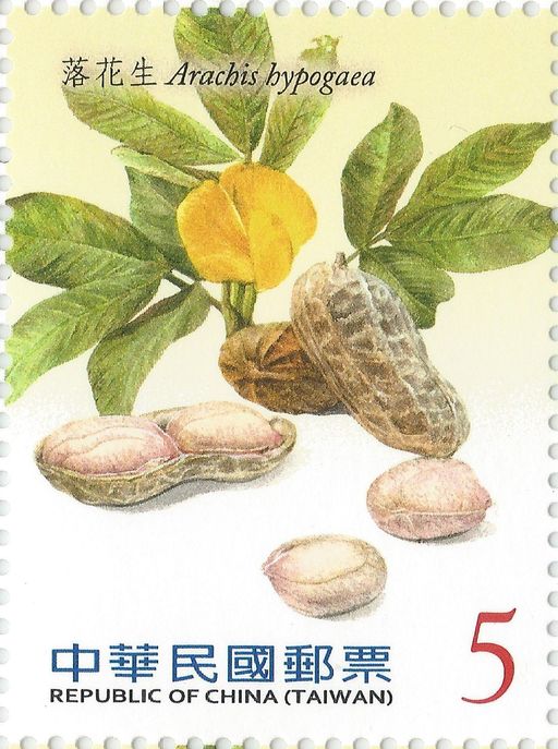 一、落花生(面值5元):一年生草本植物。茎直立、匍匐、丛生或半立。羽状复叶,互生。蝶形花。荚果为长筒形,种皮一般为淡红色。主要栽培区在云林、彰化及嘉义。主要用途为鲜食、制油及加工制品。