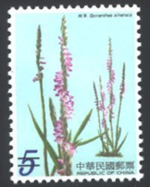 (二)绶草(面值5元):地生性兰花;叶线状披针形,生长在低海拔旷野的向阳草生地。春天开花时,纤弱的花茎上着生数十朵小花,呈螺旋状排列,犹如庙宇前的石龙盘柱而上,故又称「盘龙草」。