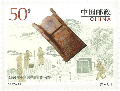 1996年我国钢产量突破一亿吨,居世界首位。这是我国钢铁工业发展进程中的一个新的里程碑。l亿吨钢是一百多年来中国人民艰苦奋斗的结果,来之不易。从1890年张之洞创办汉阳铁厂开始,到1948年的半个世纪中,我国只生产了760万吨钢。解放后,特别是改革开放以来,我国冶金事业飞速发展。经过引进和改造后的生产设备已达到世界同行业先进水平,从而使钢产量也逐年增加。1989年全国钢产量超过6000万吨,1991年超过7000吨, 1992年超过8000吨,1994年超过9000吨,1996年l亿吨。为纪念这一历史事件,邮电部特发行邮票一套,第一枚是领先于世界的中国古代冶金,表现了中国冶铁业历史悠久;第二枚是表现我国的现代化炼钢高炉群及钢包。