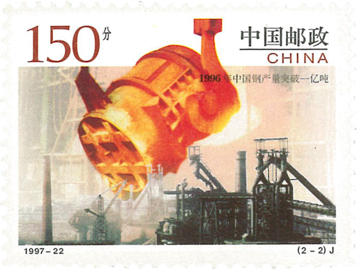 1996年我国钢产量突破一亿吨,居世界首位。这是我国钢铁工业发展进程中的一个新的里程碑。l亿吨钢是一百多年来中国人民艰苦奋斗的结果,来之不易。从1890年张之洞创办汉阳铁厂开始,到1948年的半个世纪中,我国只生产了760万吨钢。解放后,特别是改革开放以来,我国冶金事业飞速发展。经过引进和改造后的生产设备已达到世界同行业先进水平,从而使钢产量也逐年增加。1989年全国钢产量超过6000万吨,1991年超过7000吨, 1992年超过8000吨,1994年超过9000吨,1996年l亿吨。为纪念这一历史事件,邮电部特发行邮票一套,第一枚是领先于世界的中国古代冶金,表现了中国冶铁业历史悠久;第二枚是表现我国的现代化炼钢高炉群及钢包。