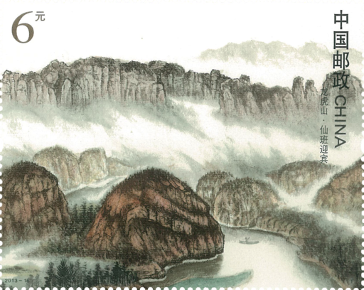 三枚邮票以传统绘画手法描绘,组成一幅完整画面.展现了仙水岩、象鼻山、正一观等著名景点,营造出道家“静净”的氛围,体现了人文与山水的和谐统一。小型张以横式构图,展现云山连绵八百里的广阔与博大,画面远景表现的排衙峰在云中若隐若现,仿佛仙班列队于云端,喜迎天下来客。