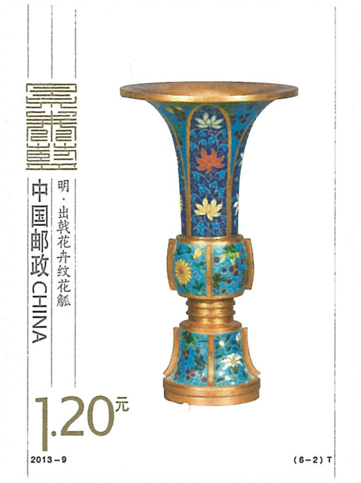 邮票表现的是景泰蓝中的精品,分别是元代缠枝莲纹鼎式炉、明代出戟花卉纹花觚、清代天鸡尊、清代缠枝莲纹多穆壶、清代兽面纹提梁卣、明代缠枝莲纹直劲瓶。