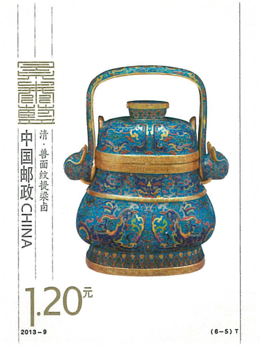 邮票表现的是景泰蓝中的精品,分别是元代缠枝莲纹鼎式炉、明代出戟花卉纹花觚、清代天鸡尊、清代缠枝莲纹多穆壶、清代兽面纹提梁卣、明代缠枝莲纹直劲瓶。