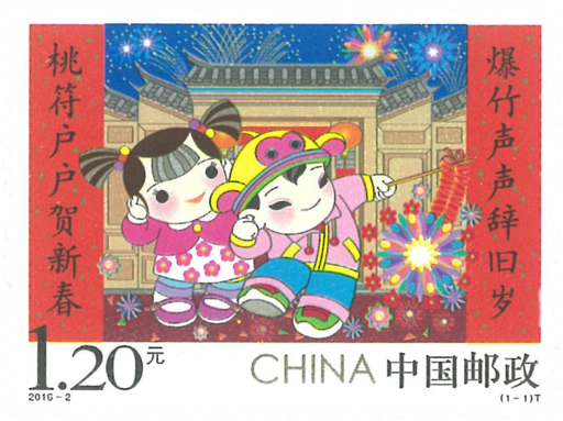春节俗称“新春”,是中华民族最隆重的传统节日。拜年是民间的传统习俗,是人们辞旧迎新、相互表达美好祝愿的一种方式。在农历春节里,一张张喜气洋洋的笑脸,一声声“给您拜年啦!”,一句句“新年快乐,万事如意!”的问候,使节日洋溢着浓浓的喜气和温馨,体现出中华民族特有的人情味。中国民间有“开门爆竹”一说。即在新的一年到来之际,家家户户开门的第一件事就是燃放爆竹,以爆竹声除旧迎新。邮票画面中,“欢欢”戴着“猴帽”双手高举竹竿,上面挂着火红的正在燃放的鞭炮,炮花如绽放的春花,绚丽多彩;“喜喜”双手捂耳,一脸喜悦,笑逐颜开。两侧吉祥寓意的对联:“爆竹声声辞旧岁桃符户户贺新春”,烘托出过大年喜庆祥和的新年气氛。
