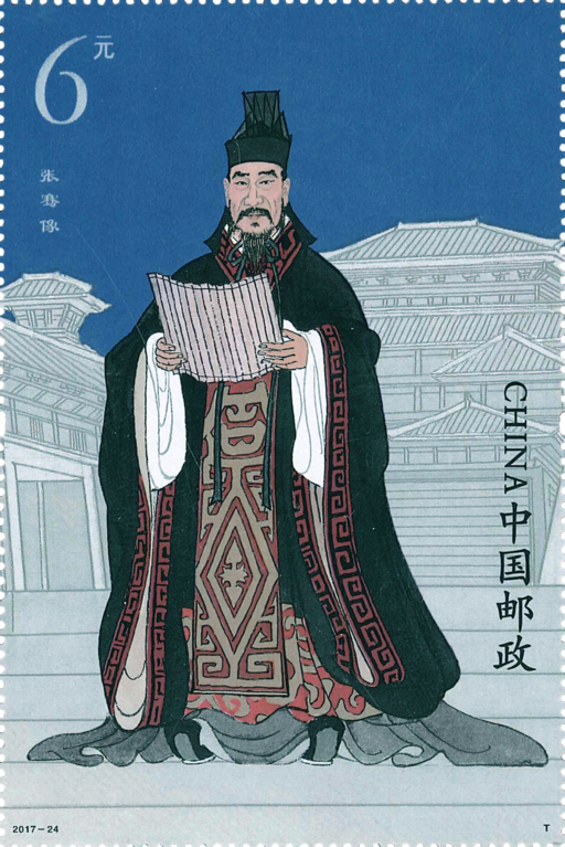 张骞(前164-前114),字子文,汉中城固(今陕西城固县)人,中国古代杰出的外交家、探险家、旅行家。张骞一生曾两次出使西域,行经大宛、康居、大月氏、大夏等地,足迹遍及中亚、西亚各地,开辟了中国与西域诸国的沟通往来之路,被视为开拓丝绸之路的第一人。他将中原文明传播至西域,又从西域诸国引进了汗血马、葡萄、苜蓿、石榴、胡麻等物种到中原,促进了东西方文明的交流。自张骞以后,中原与西域关系密切、往来不断,政治、经济、文化交流频繁。张骞对开辟从中国通往西域的丝绸之路所作的卓越贡献,至今为世人称道。2014年,张骞墓作为“丝绸之路”遗产点之一,入选世界文化遗产名录。小型张为张骞像,以汉代宫廷建筑环境为背景,展现了晚年张骞的英姿。