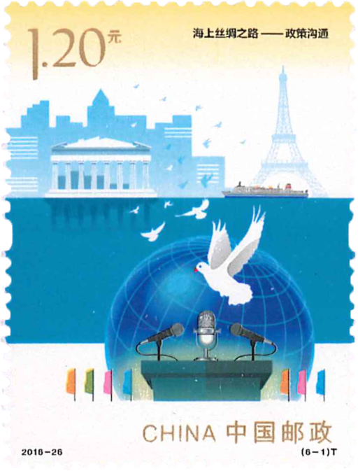海上丝绸之路是指中国与世界其他地区进行经济文化交流、交往的海上通道。在唐、宋、元的繁盛期,中国境内主要由泉州、广州、宁波三个主港和其他支线港组成,为联合国教科文组织唯一认定的海上丝绸之路起点。丝绸之路不是具体的一条路,而是后世对中国与西亚、中亚、西方所有来往通道的统称。在唐中期前,对外主通道是陆上丝绸之路,之后由于战乱及经济重心转移等原因,海上丝绸之路取代了陆路成为中外贸易交流主通道,在宋元时期是范围覆盖大半个地球的人类历史活动和东西方文化经济交流的重要载体。2013年9月和10月,中国国家主席习近平在出访中亚和东南亚国家期间,先后提出共建“丝绸之路经济带”和“21世纪海上丝绸之路”的重大倡议。这一构思以“政策沟通、设施联通、贸易畅通、资金融通、民心相通、海上交通”为主要内容,为沿线各国经济社会共同发展创造更加美好的明天。“21世纪海上丝绸之路”建设不仅延续古代海上丝绸之路曾经繁荣的海上合作,还赋予其新的时代内涵,使之成为促进共同发展、实现共同繁荣的合作共赢之路,增进理解信任、加强全方位交流的和平友谊之路。邮票背景将海上丝绸之路沿线的知名历史古迹与现代地标建筑及示意性的城市建筑群相结合,由古至今,反映出海上丝绸之路的地理范围和其绵延不绝的悠久历史与欣欣向荣的时代风貌。