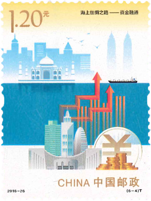 海上丝绸之路是指中国与世界其他地区进行经济文化交流、交往的海上通道。在唐、宋、元的繁盛期,中国境内主要由泉州、广州、宁波三个主港和其他支线港组成,为联合国教科文组织唯一认定的海上丝绸之路起点。丝绸之路不是具体的一条路,而是后世对中国与西亚、中亚、西方所有来往通道的统称。在唐中期前,对外主通道是陆上丝绸之路,之后由于战乱及经济重心转移等原因,海上丝绸之路取代了陆路成为中外贸易交流主通道,在宋元时期是范围覆盖大半个地球的人类历史活动和东西方文化经济交流的重要载体。2013年9月和10月,中国国家主席习近平在出访中亚和东南亚国家期间,先后提出共建“丝绸之路经济带”和“21世纪海上丝绸之路”的重大倡议。这一构思以“政策沟通、设施联通、贸易畅通、资金融通、民心相通、海上交通”为主要内容,为沿线各国经济社会共同发展创造更加美好的明天。“21世纪海上丝绸之路”建设不仅延续古代海上丝绸之路曾经繁荣的海上合作,还赋予其新的时代内涵,使之成为促进共同发展、实现共同繁荣的合作共赢之路,增进理解信任、加强全方位交流的和平友谊之路。邮票背景将海上丝绸之路沿线的知名历史古迹与现代地标建筑及示意性的城市建筑群相结合,由古至今,反映出海上丝绸之路的地理范围和其绵延不绝的悠久历史与欣欣向荣的时代风貌。