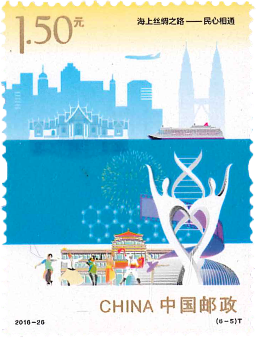 海上丝绸之路是指中国与世界其他地区进行经济文化交流、交往的海上通道。在唐、宋、元的繁盛期,中国境内主要由泉州、广州、宁波三个主港和其他支线港组成,为联合国教科文组织唯一认定的海上丝绸之路起点。丝绸之路不是具体的一条路,而是后世对中国与西亚、中亚、西方所有来往通道的统称。在唐中期前,对外主通道是陆上丝绸之路,之后由于战乱及经济重心转移等原因,海上丝绸之路取代了陆路成为中外贸易交流主通道,在宋元时期是范围覆盖大半个地球的人类历史活动和东西方文化经济交流的重要载体。2013年9月和10月,中国国家主席习近平在出访中亚和东南亚国家期间,先后提出共建“丝绸之路经济带”和“21世纪海上丝绸之路”的重大倡议。这一构思以“政策沟通、设施联通、贸易畅通、资金融通、民心相通、海上交通”为主要内容,为沿线各国经济社会共同发展创造更加美好的明天。“21世纪海上丝绸之路”建设不仅延续古代海上丝绸之路曾经繁荣的海上合作,还赋予其新的时代内涵,使之成为促进共同发展、实现共同繁荣的合作共赢之路,增进理解信任、加强全方位交流的和平友谊之路。邮票背景将海上丝绸之路沿线的知名历史古迹与现代地标建筑及示意性的城市建筑群相结合,由古至今,反映出海上丝绸之路的地理范围和其绵延不绝的悠久历史与欣欣向荣的时代风貌。