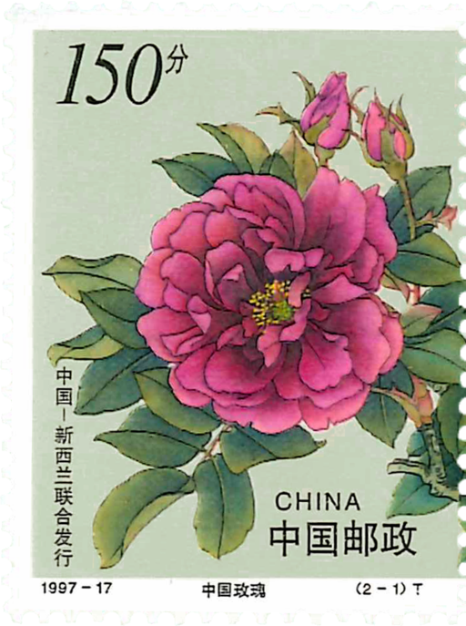这套邮票是由我国邮电部与新西兰邮政有限公司联合发行。两枚邮票分别展示新西兰最著名的月季品种一“白云之乡”和中国北京的妙峰山玫瑰。月季属蔷薇科,低矮直立落叶灌木,奇数羽状复叶,夏季开花,花数朵同生,深红至淡红色居多,偶有白色。园艺上变种颇多。花及根、叶可入药,有活血、祛瘀、拔毒、消肿作用。玫瑰亦属蔷薇科,落叶灌木,其茎密生锐刺,羽状复叶,上面有皱纹。夏季开花,花朵单生,紫红至白多种色彩,气味芳香。原产我国,久经栽培,可供观赏。花及根入药,有理气、活血、收敛作用。