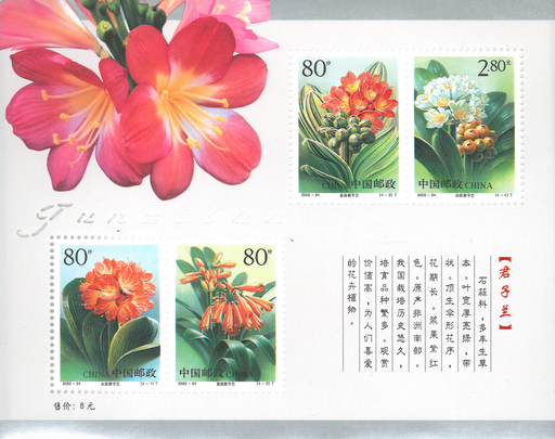 君子兰别名剑叶石蒜、大叶石蒜、达木兰,系石蒜科,君子兰属。原产非洲南部,现世界各地均有栽培,分布甚广,我国园林中各地亦有栽培。君子兰为多年生草本植物,剑形叶,二列式左右对生,呈鱼鳞状排列在假鳞茎上,边缘整齐,伞形花序,离瓣花冠。花色有红、桔红、桔黄、白、绿等,花轴长、短、精细等因品种而异,果实浆果成熟时紫红色。种子一次可结多个,需根系。杂交的品种间形态差异很大。它常年青绿,株形挺拔,花朵美丽。在北国大地千里冰封,草木凋零之时,君子兰却在春节前后竟相开放,呈现一派欣欣向荣的气象,使人赏心悦目。常见的有:大花君子兰和垂笑君子兰。本套邮票选用了大花君子兰、垂笑君子兰、金丝君子兰和白花君子兰。